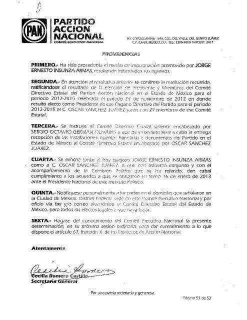 Resolución de Gustavo Madero, presidente del CEN del PAN, que ratifica por «Providencias» a Óscar Sánchez en Edomex.