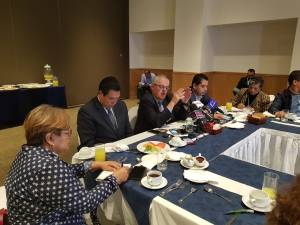 En la conferencia estuvo acompañado por el ex diputado local y regidor electo de Tlalnepantla, Adrián Juárez Jiménez y Carlos Pérez Cuevas, ex coordinador del Grupo Parlamentario en San Lázaro.