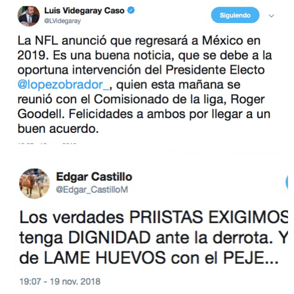 A las 15:37 horas, Videgaray escribió el siguiente mensaje: “La NFL anunció que regresará a México en 2019. Es una buena noticia, que se debe a la oportuna intervención del Presidente Electo @lopezobrador_, quien esta mañana se reunió con el Comisionado de la liga, Roger Goodell. Felicidades a ambos por llegar a un buen acuerdo”.