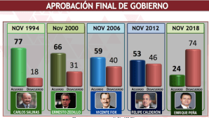 De esta manera, Peña entregará el poder presidencial al tabasqueño Andrés Manuel López Obrador, siendo aprobado en su ejercicio público por el 24 por ciento de los mexicanos, en tanto que 74 por ciento de los habitantes estarán en desacuerdo con esta administración en el cierre de la misma.
