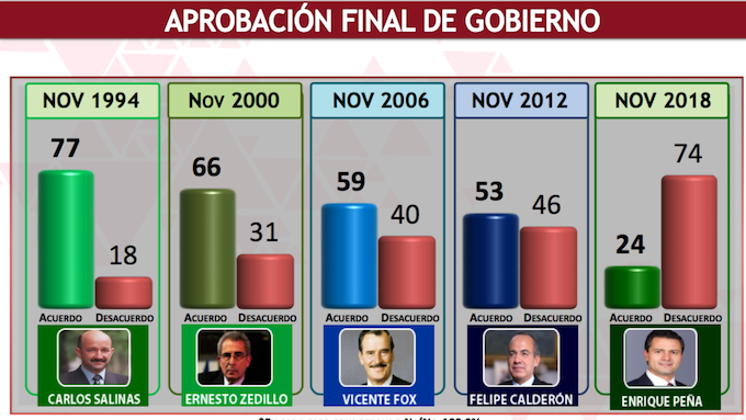 De esta manera, Peña entregará el poder presidencial al tabasqueño Andrés Manuel López Obrador, siendo aprobado en su ejercicio público por el 24 por ciento de los mexicanos, en tanto que 74 por ciento de los habitantes estarán en desacuerdo con esta administración en el cierre de la misma.