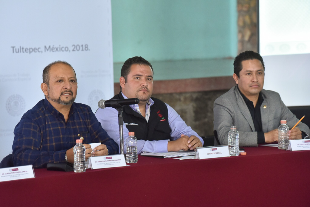 Por la izquierda: La Comisión de Protección Civil de la LX Legislatura sesionó en el municipio de Tultepec, donde el presidente de la misma, Max Correa Hernández, dijo que “la organización de los artesanos pirotécnicos será fundamental para su crecimiento económico y se necesita de una figura asociativa legal para incursionar en actividades empresariales que revaloren la pirotecnia”.