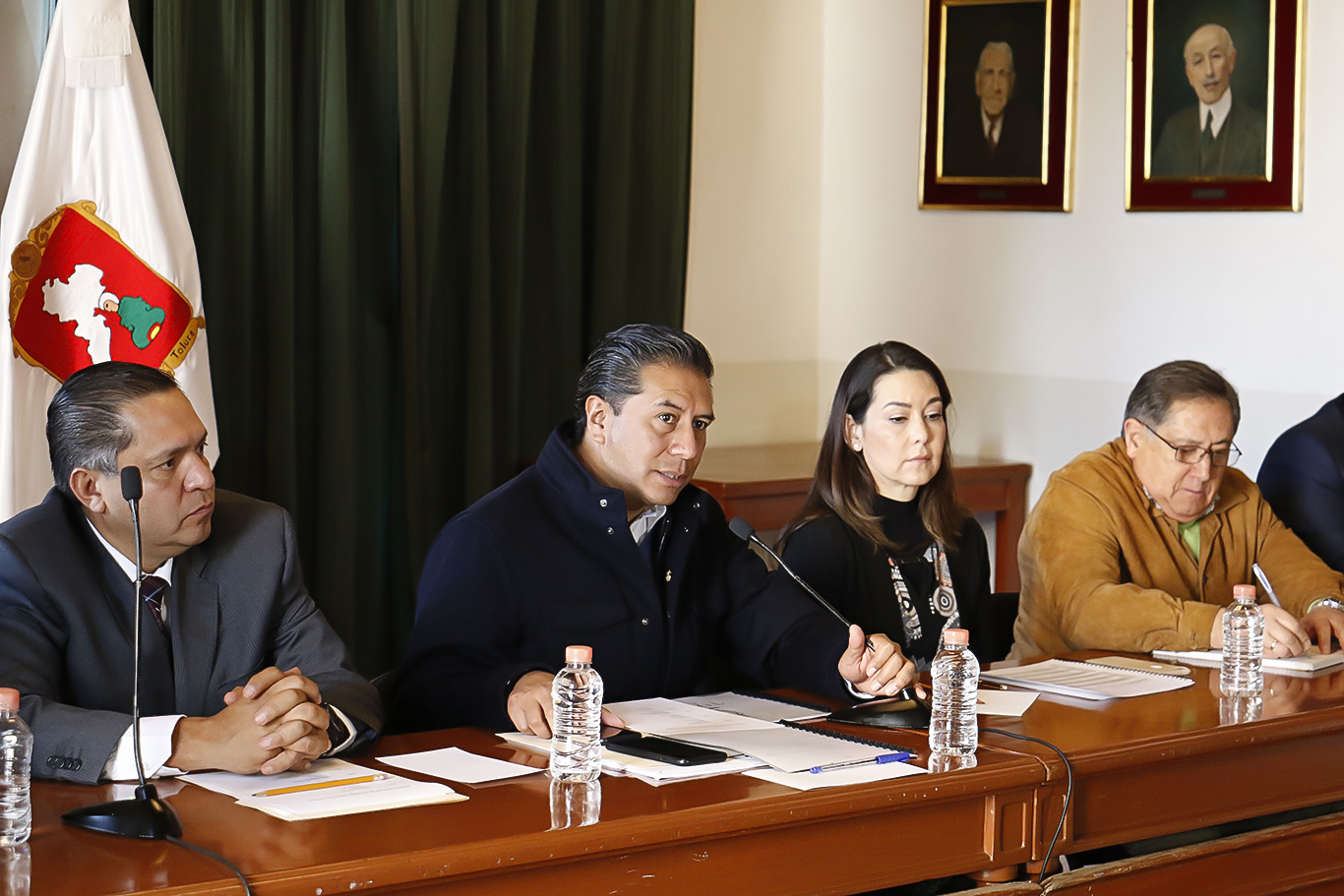 Por la izquierda: El alcalde de Toluca, Juan Sánchez Gómez, informó que a una semana de iniciar la administración local los operativos de seguridad, recuperación de espacios públicos en la zona centro, retiro del comercio informal, limpieza de los Portales y la Plaza González Arratia, poda de árboles, mantenimiento a camellones, jardines y parques, acopio de árboles de navidad y del Programa de Emergencia de Bacheo y Repavimentación, muestran resultados positivos y con buena respuesta por parte de la población.
