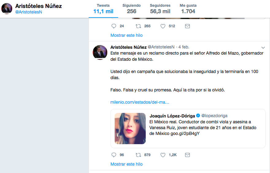 “Este mensaje es un reclamo directo para el señor Alfredo del Mazo, gobernador del Estado de México. Usted dijo en campaña que solucionaba la inseguridad y la terminaba en 100 días. Falso. Falsa y Cruel su promesa…”(sic)