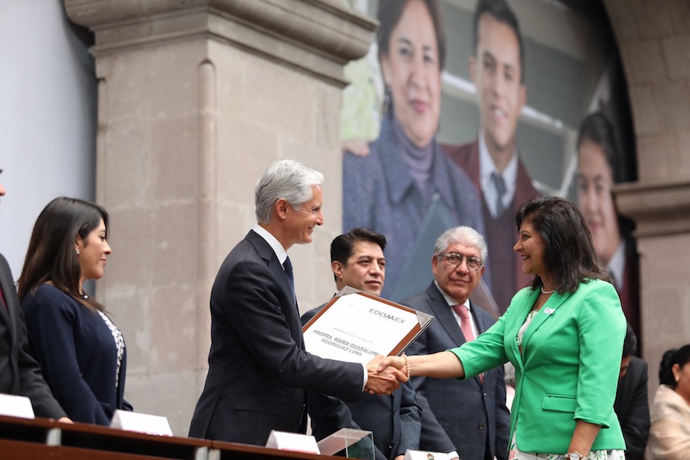 Se entregó la Presea Honor Estado de México, a 24 docentes; 12 del Subsistema estatal y 12 del Subsistema federalizado, como un reconocimiento a maestras y maestros que han cumplido 25 años de trayectoria, destacándose por su profesionalismo eficiencia y méritos profesionales. Aunado a lo anterior, otorgó la condecoración “Maestro Altamirano» y el estímulo “Laura Méndez de Cuenca», a profesores mexiquenses de los subsistemas estatal y federalizado, que se reunieron en el patio central de Palacio de Gobierno.