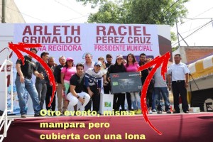 De acuerdo con las imágenes que fueron publicadas en redes sociales, la misma mampara utilizada para eventos oficiales del ayuntamiento fue usada para los actos de promoción de Arleth Grimaldo y Raciel Pérez. Está comprobado que solamente se sobrepusieron las vinilonas con los nombres en color rosa y vino de ambos servidores públicos, como se muestra en las imágenes que compartimos en las redes sociales de esta columna.