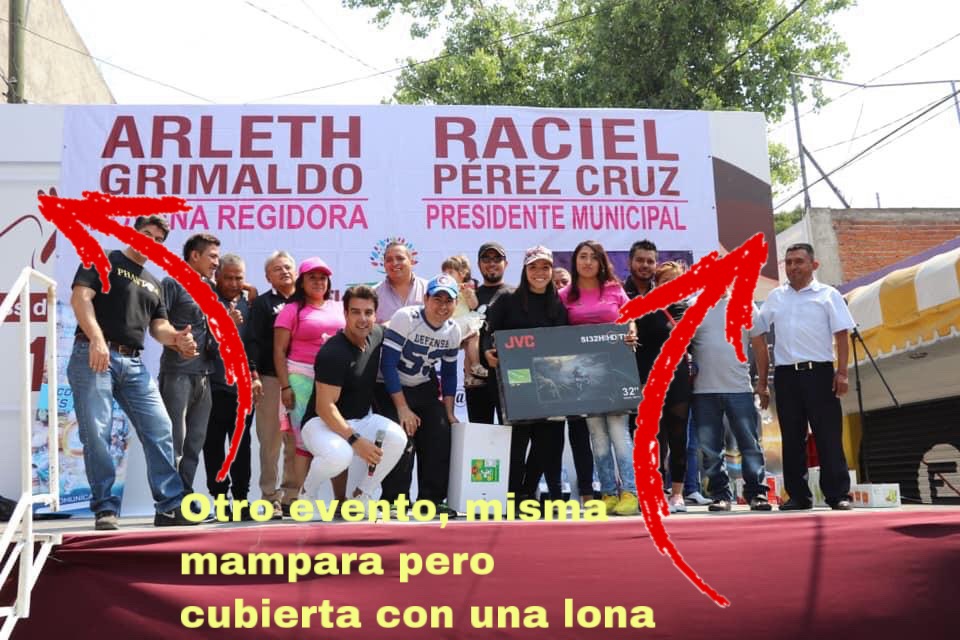 De acuerdo con las imágenes que fueron publicadas en redes sociales, la misma mampara utilizada para eventos oficiales del ayuntamiento fue usada para los actos de promoción de Arleth Grimaldo y Raciel Pérez. Está comprobado que solamente se sobrepusieron las vinilonas con los nombres en color rosa y vino de ambos servidores públicos, como se muestra en las imágenes que compartimos en las redes sociales de esta columna.