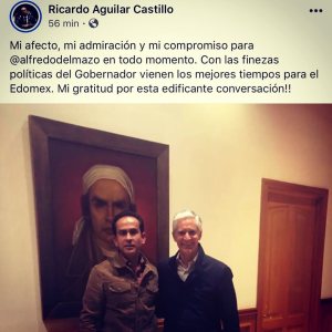 “Con las finezas atenciones del gobernador vienen los mejores tiempos para el Estado de México”, escribió Aguilar en sus redes sociales.
