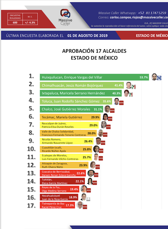 Por la derecha: La empresa encuestadora Massive Caller dio a conocer la más reciente aprobación ciudadana que tienen 17 alcaldes mexiquenses, a siete meses de su administración, destaca que el panista de Huixquilucan Enrique Vargas del Villar se mantiene como el mejor calificado en el estado de México, mientras que el morenista, Juan Rodolfo Sánchez Gómez ocupa el cuarto sitio de la lista, ambos son alcaldes por segunda ocasión.