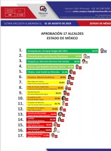 La encuesta realizada el primero de agosto y difundida el fin de semana, detalla que a pesar de que la mayoría de los municipios son gobernados por el partido Movimiento de Regeneración Nacional (MORENA) sus ediles no son los mejor calificados, ya que la aprobación ciudadana es mayor para los presidentes municipales de otros partidos como Acción Nacional (PAN) en Huixquilucan, para el Revolucionario Institucional (PRI) en Chimalhuacán e Ixtapaluca.