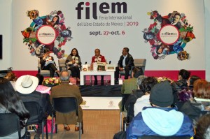 Por el centro: Dora Elena Real Salinas, la vocal Ejecutiva del Consejo Estatal para el Desarrollo Integral de los Pueblos Indígena (CEDIPIEM), participó en la Conferencia “2019, Año Internacional de las Lenguas Indígenas”, en el marco de la Feria Internacional del Libro, FILEM 2019, donde dijo que para revitalizar el uso de las lenguas indígenas que se hablan en el territorio de la entidad, el Gobierno estatal impulsa de manera permanente la publicación de diversas obras y documentos en lengua materna para que a través de la palabra escrita se preserve también la herencia multilingüística.