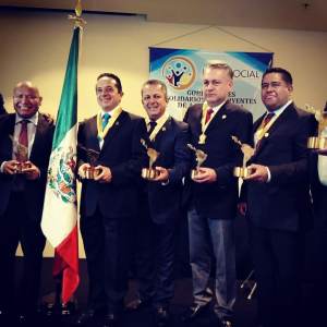 Por la izquierda: El gobernador de Quintana Roo, Carlos Joaquín González, así como los alcaldes de Atlacomulco, Roberto Téllez Monroy; de Tlalnepantla, Raciel Pérez Cruz y Erick Coronel, en representación de Juan Rodolfo Sánchez Gómez, de Toluca, recibieron los Premios Solidaridad e Inclusión Social Latinoamérica en Colombia