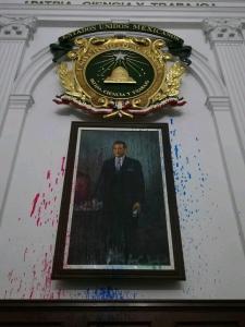 Aunado a ello lanzaron pintura al retrato gigante del ex presidente López Mateos que se encuentra en el interior del Aula Magna que lleva el nombre de dicho personaje, ahí continuaron las consignas y colocaron leyendas en paredes.
