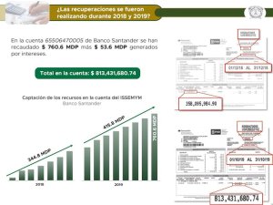 El secretario de Finanzas aseguró que en la cuenta 65506470005, de Banco Santander, se han recaudado más de 760 millones de pesos, además cuenta con 53.6 millones de pesos generados por intereses. La suma es de 813 millones 431 mil 680 pesos con 74 centavos, además mostró que en 2018 la cuenta reunía 344 millones de pesos y en 2019 ascendió a más de 415 millones.