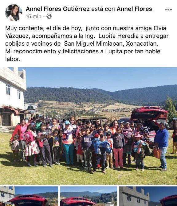 Por la derecha: El fin de semana se observó a la ex legisladora local del Partido Acción Nacional (PAN), Anel Flores Gutiérrez, entregando cobijas en Xonacatlán con gente identificada con el PT, luego de que en los últimos años perdió toda posibilidad en el PAN, ante su nulo liderazgo.