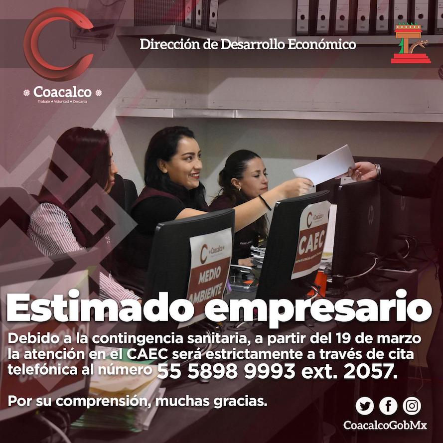 La Dirección de Desarrollo Económico informó que el Centro de Atención Empresarial de Coacalco (CAEC) amplía el plazo para el trámite de licencias de funcionamiento hasta el 31 de mayo así como para la inscripción y actualización al registro municipal de unidades económicas 2020.
