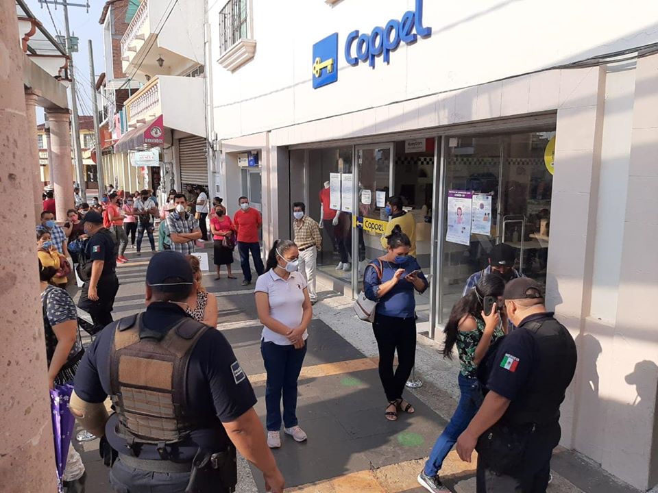 Por la izquierda2: El gobierno municipal de Tejupilco en coordinación con la oficina de Jurisdicción de Regulación Sanitaria, llevaron acciones para prohibir la venta de artículos no esenciales en las tiendas Elektra, Coppel, de modo que únicamente pueden operar sus respectivos bancos.