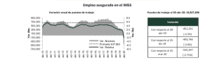 Por otro lado, el IMSS reveló que al 30 de abril se registraron 19 millones 927 mil 696 puestos de trabajo; de los cuales 86.4 por ciento son permanentes y el 13.6 por ciento son eventuales.