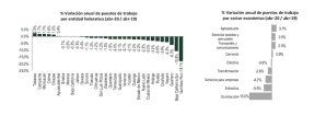 En cuanto a las entidades del país, las entidades más golpeadas en desempleo son Quintana Roo; Baja California Sur, Guerrero y Nayarit, con una variación de -18.1; -10.8; -6.3; -4.3 por ciento, respectivamente. La variación del estado de puestos de trabajo en el estado de México fue de -2.2 por ciento en relación al mes de abril del 2019.