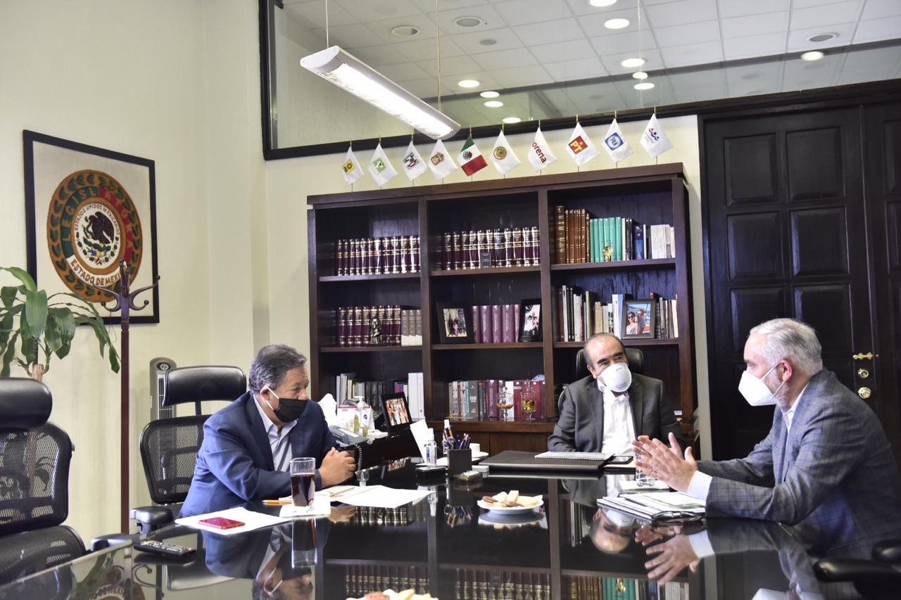 Por la izquierda: El secretario de Salud, Gabriel O´Shea Cuevas, se reunió con el senador de la República, Higinio Martínez Miranda y Maurilio Hernández González, el presidente de la Junta de Coordinación Política de la LX Legislatura Local, con quienes acordó mecanismos para fortalecer la comunicación pública sobre la situación de la pandemia en el Estado de México.