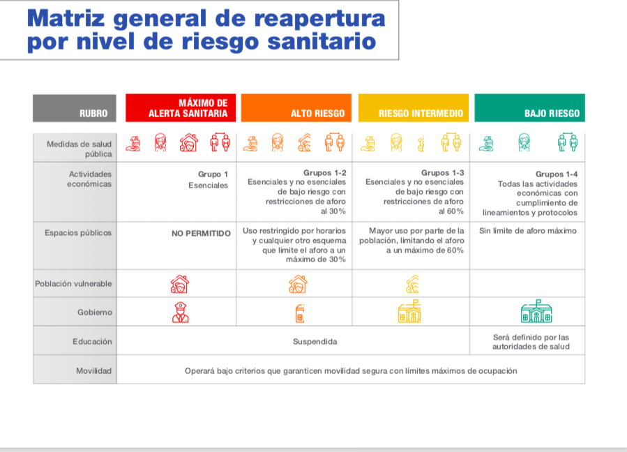 Las cuatro regiones arrancarían el primero de Junio en el semáforo máximo de alerta sanitaria, donde únicamente se desarrollarán las actividades económicas esenciales (sector primario, manufactura, siderúrgica, logística), no están permitidos los espacios públicos.
