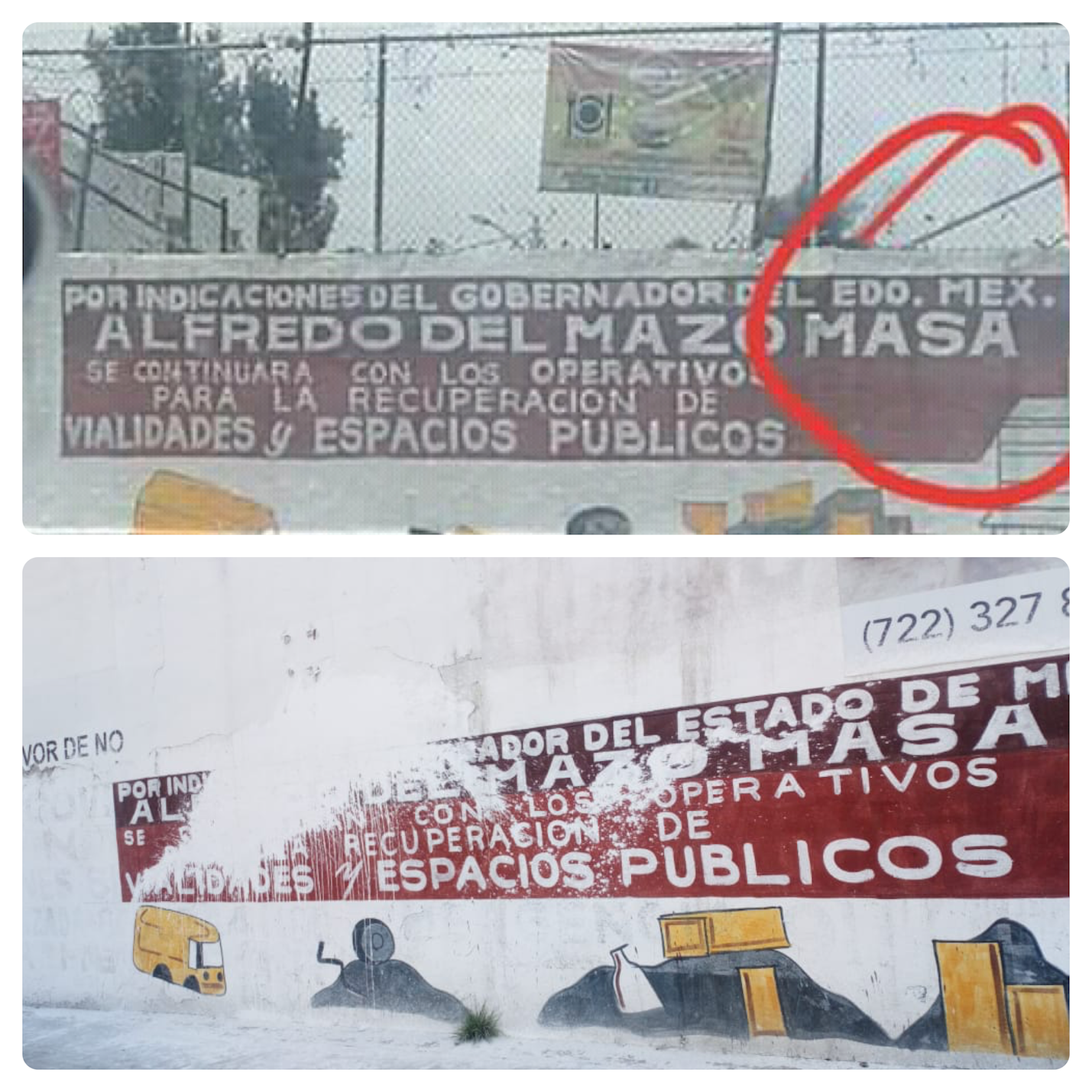 Por la izquierda: En Los Reyes La Paz se consideró un exceso por parte de la alcaldesa, Olga Medina Serrano o quizá de gente cercana, quienes colocaron leyendas en diversas bardas donde aseguraban que el gobernador Alfredo del Mazo Maza instruyó la serie de operativos para “ordenar” el comercio.
