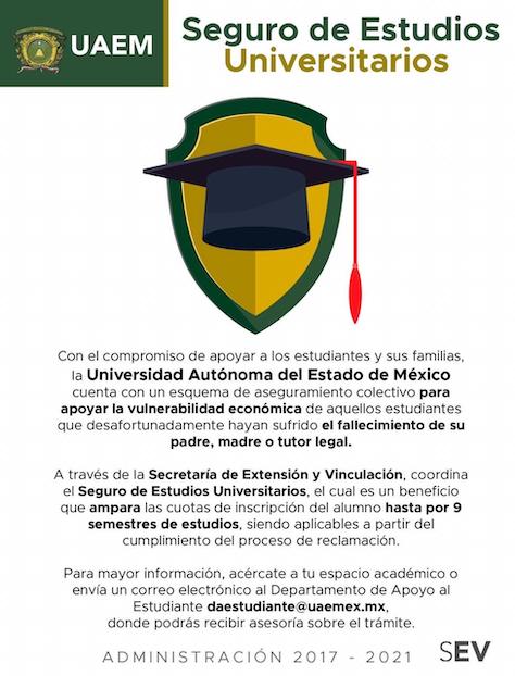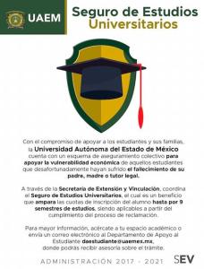 La Secretaria de Extensión y Vinculación es la encargada de tramitar el Seguro de Estudios Universitarios, al cual los alumnos que hayan perdido a su madre, padre o tutor legal pueden acceder.