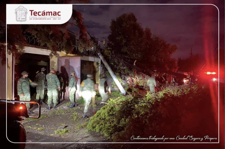 A la hora de cierre de edición de esta columna, elementos de Protección Civil y Bomberos, Comisaría General de Seguridad y Tránsito Municipal, Dirección General de Ecología y Administración del Medio Ambiente, Logística y Eventos, así como el Ejército Mexicano, trabajaban en la liberación de calles y avenidas, que se vieron afectadas por la caída de árboles y postes en varios puntos.