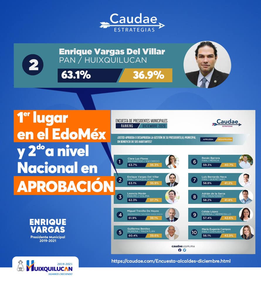 Por la derecha: El presidente Municipal de Huixquilucan, Enrique Vargas del Villar, celebró los datos que dio a conocer la empresa “Caudae Estrategias”, que lo colocó como segundo edil con mayor aprobación ciudadana del país, con 63.1 por ciento.