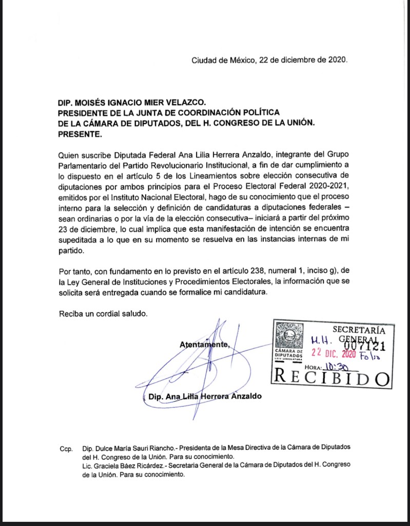 En lo que tiene que ver con la próxima elección federal, también trascendió la lista de los actuales diputados federales que manifestaron su intención de contender para la elección consecutiva, entre ellos Ana Lilia Herrera Anzaldo, del PRI; Óscar González Yáñez, del PT; Ruth Salinas Reyes, de Movimiento Ciudadano; Laura Rojas Hernández, del PAN, Iván Arturo Rodríguez, del PAN, entre otros.