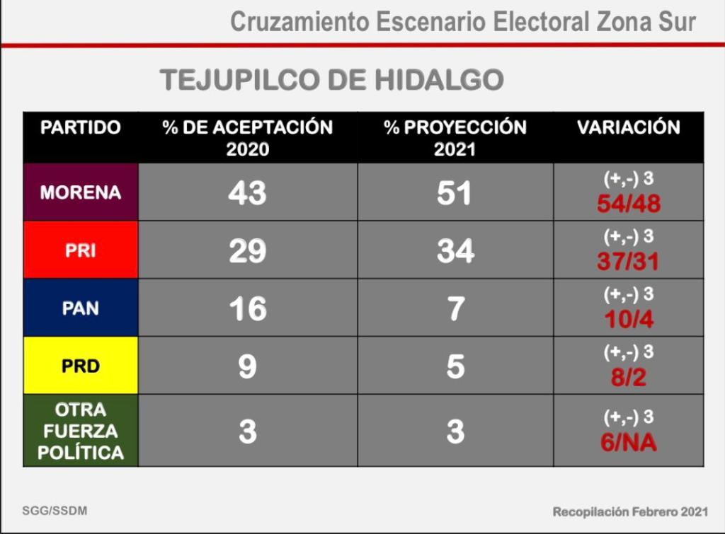 Rumbo a la elección local se han difundido encuestas que establecen que MORENA tiene el 51 por ciento de la intención de voto en Tejupilco, mientras que el PRI representa el 34 por ciento.