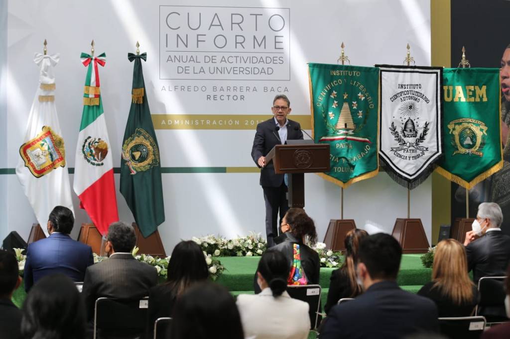 Alfredo Barrera Baca, el rector de la Universidad Autónoma del Estado de México (UAEM) rindió su cuarto informe de labores, frente al Consejo Universitario y el gobernador, Alfredo del Mazo. Se despidió así; “gracias a la comunidad que me dio esta oportunidad de reflexión, trabajo y servicio, gracias Alma Mater por tu grandeza, Patria, Ciencia y Trabajo”.