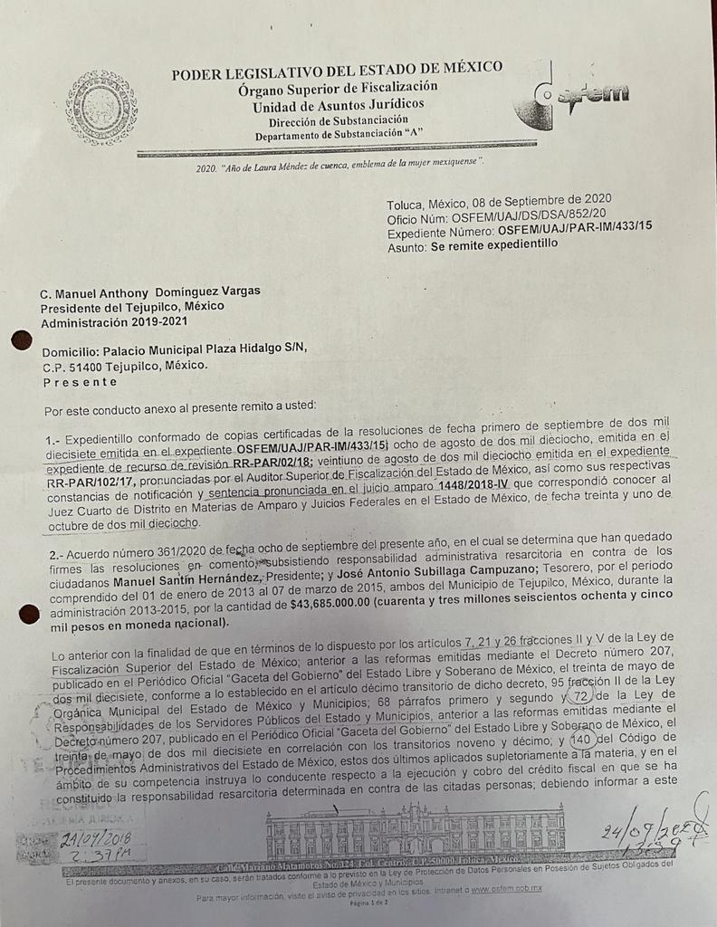 En el documento se informó al gobierno municipal de Tejupilco que mediante el acuerdo numero 361/2020 de fecha 08 de Septiembre del 2020 se determinó dejar firmes las resoluciones en contra de Manuel Santín y Subillaga, por la cantidad de 43 millones 685 mil pesos.