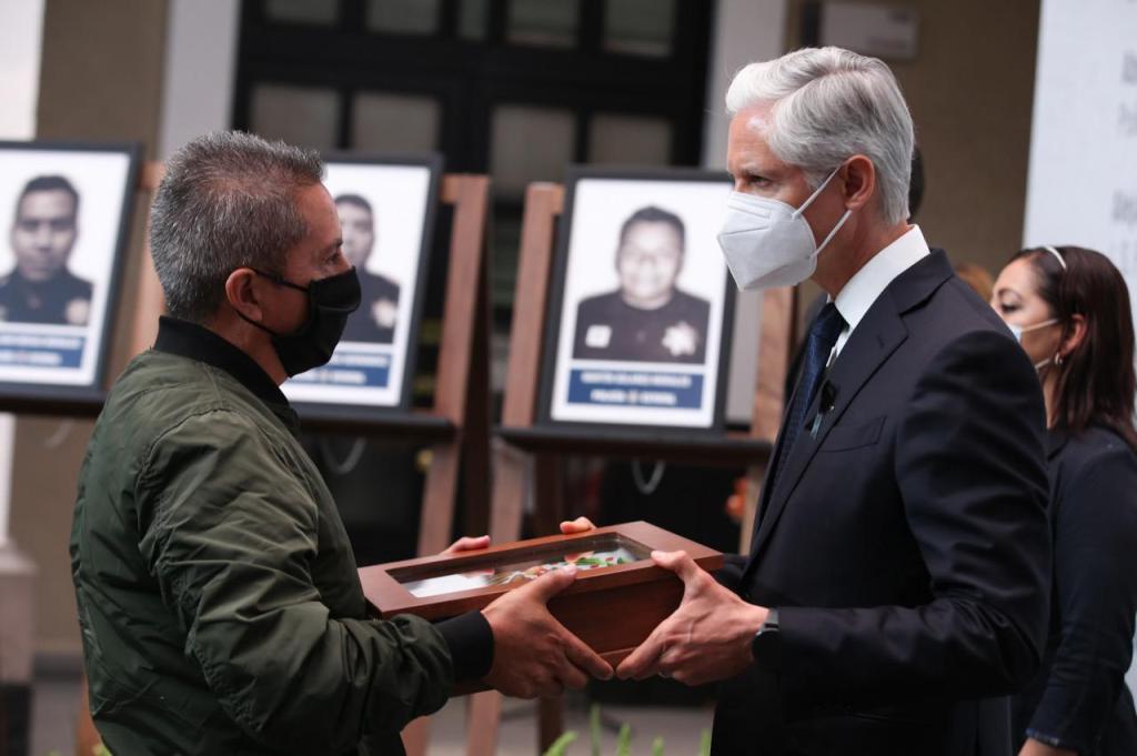 Alfredo Del Mazo entregó a los familiares de los elementos caídos reconocimientos post mortem, a quienes les expresó su más sentido pésame y agradecimiento por la labor que los policías llevaron a cabo con entrega y compromiso con la sociedad, anteponiendo su vida por el bienestar de los mexiquenses.