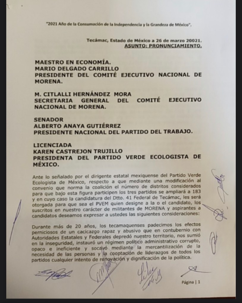 - Piden morenistas de Tecámac a dirigencia nacional reconsiderar candidatura del PVEM