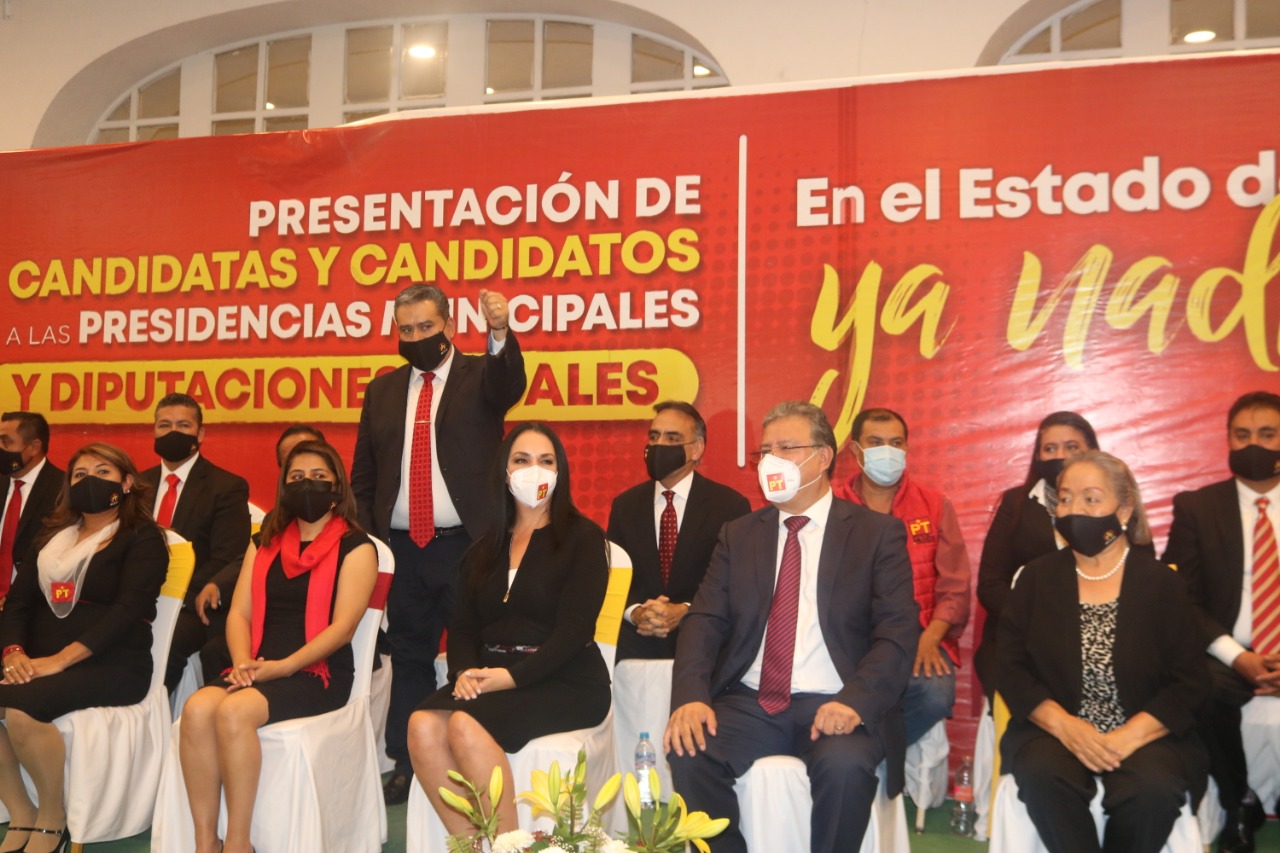 Por la izquierda: La dirigencia estatal del Partido del Trabajo (PT) tomó protesta a los personajes que fueron designados candidatos a miembros de los ayuntamientos y diputados locales, algunos de estos forman parte de la coalición con MORENA y PANAL, por ello estos últimos institutos políticos referidos no determinaron abanderados en dichos sitios.