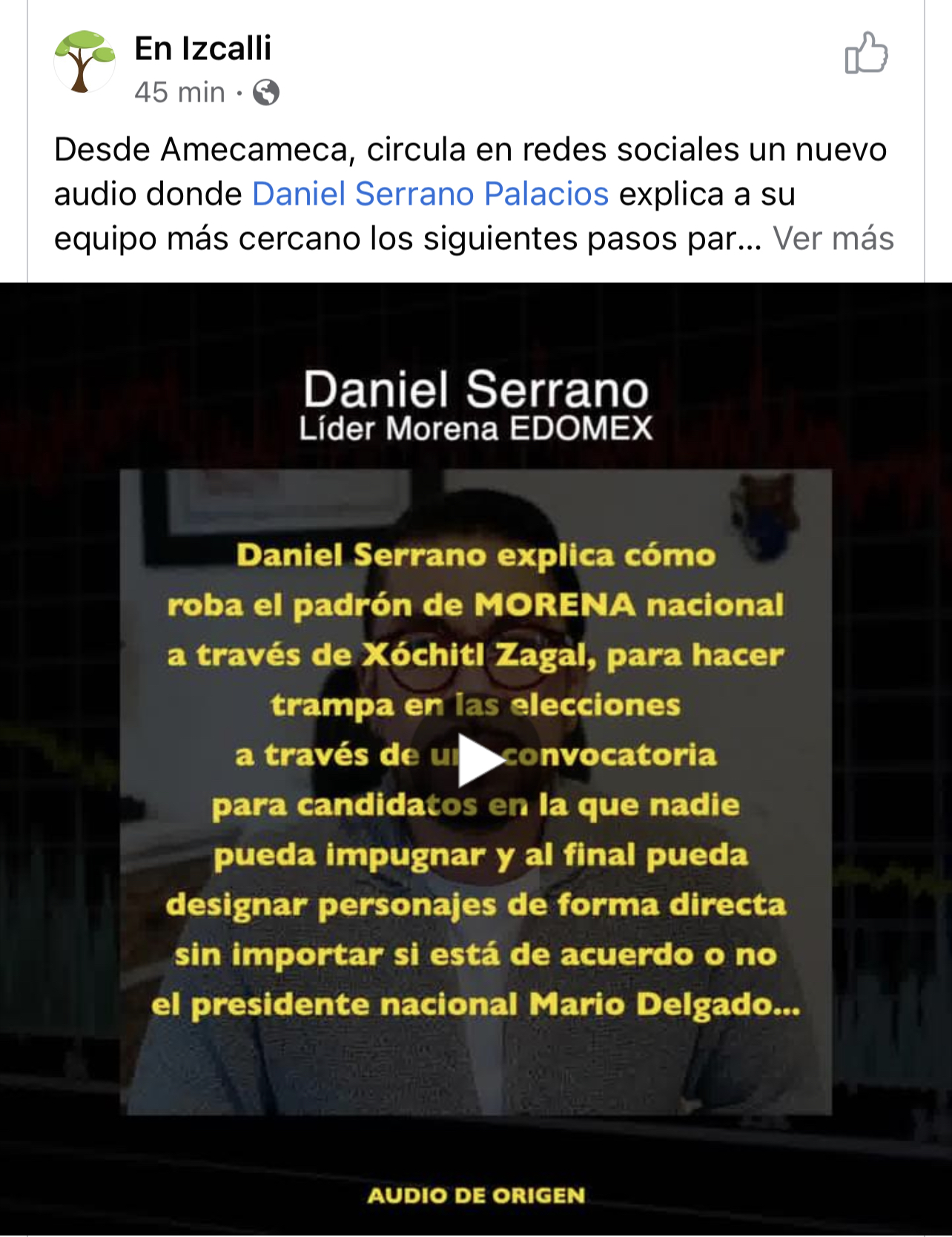 Por la izquierda2: A la media noche se publicó en la página de Facebook “En Izcalli” un audio que la misma atribuye a Daniel Serrano Palacios, el dirigente de la corriente identificada como “Los Puros” de MORENA, donde el hablante explica en videoconferencia que la convocatoria para elegir candidatos fue posiblemente amañada para procurar que no la impugnaran y que los grupos impusieran al candidato que quisieran.