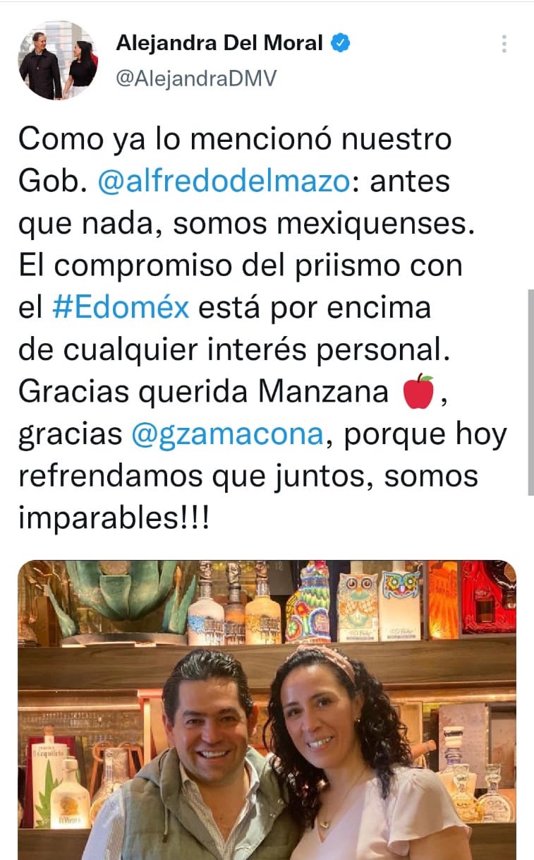 María Rosa Hernández se reunió con Guillermo Zamacona, quienes compartieron una fotografía donde se les observa en muy buen ánimo, misma que compartió la dirigente estatal del PRI, Alejandra del Moral Vela, con el siguiente mensaje: “como ya lo mencionó nuestro gobernador, Alfredo del Mazo, antes que nada somos mexiquenses. El compromiso del priismo con el Edomex esta por encima de cualquier interés personal. Gracias querida manzana porque hoy refrendamos que juntos, somos imparables”. Interesante.