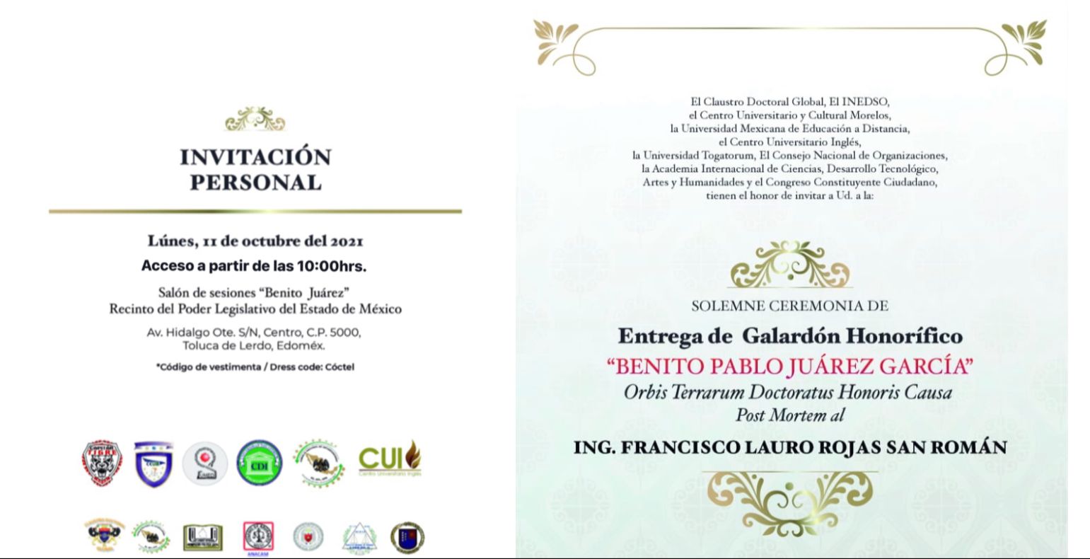 Por el centro2: El próximo lunes, en la sede del Poder Legislativo del Estado de México, se rendirá un homenaje y se entregará el Galardón Honorífico “Benito Juárez García” Post Mortem a Francisco Lauro Rojas San Román, ex diputado federal y local del PRI, quien falleció en febrero del 2018, a consecuencia de un ataque a balazos, previo a su designación como candidato a la alcaldía de Cuautitlán Izcalli.