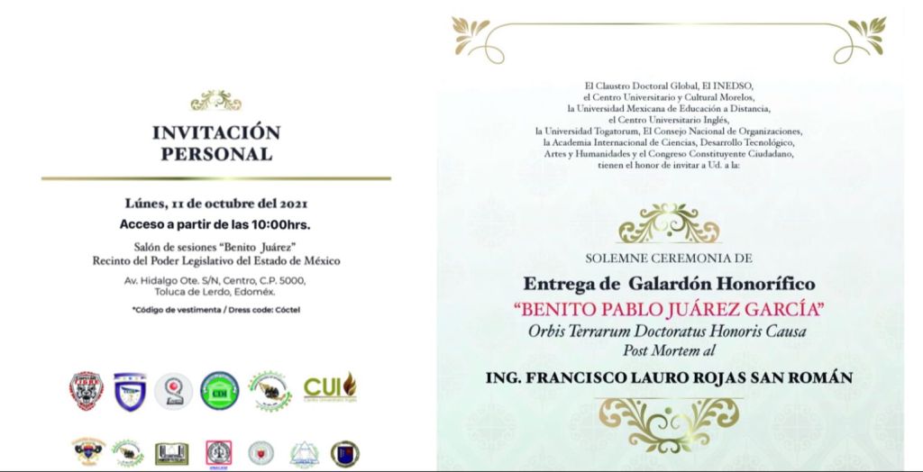 Este reconocimiento lo entregarán –entre otras instituciones- el Claustro Doctoral Global, el INEDSO, el Centro Universitario y Cultural Morelos, la Universidad Mexicana de Educación a Distancia y el Centro Universitario Inglés. En ceremonia solemne se recordará al político priista y empresario mexiquense.
