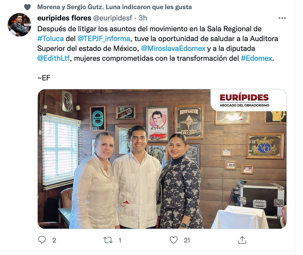 Pero las cosas siguen igual. El representante de MORENA ante el Instituto Nacional Electoral (INE), Euripides Flores Pacheco, presumió una fotografía junto a Miroslava Carrillo Martínez y la diputada Marisol Mercado, tras una comida en Toluca.