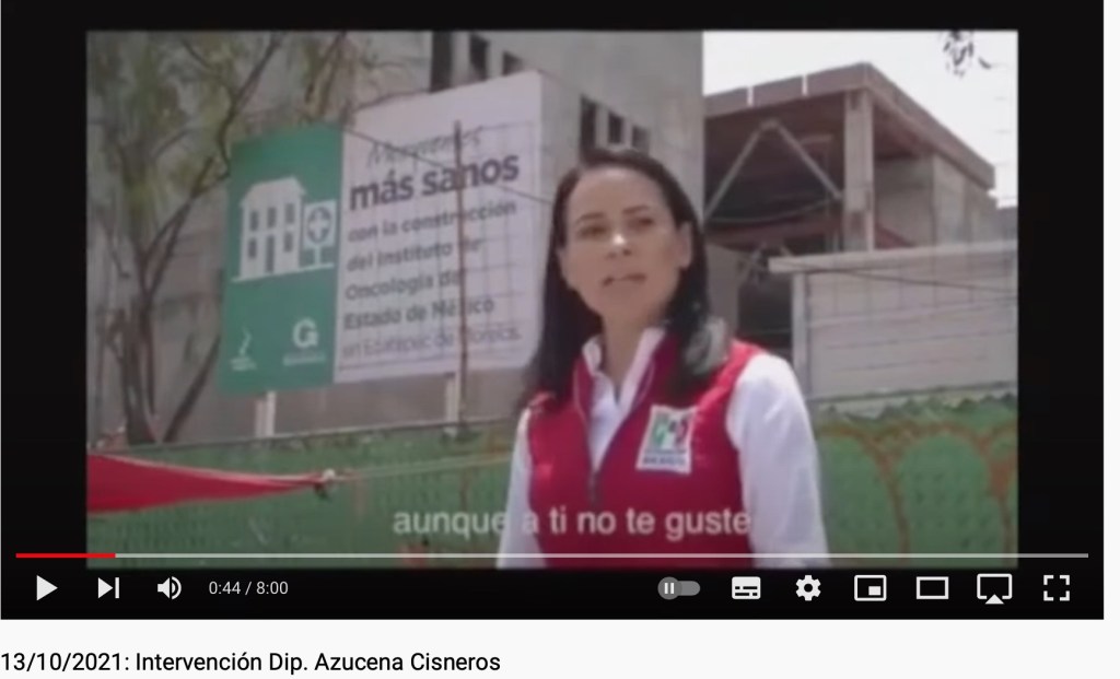 En el mismo, Alejandra del Moral habla de la construcción de un hospital para atender a enfermos con cáncer en Ecatepec, que a decir de la diputada morenista, se trató de un montaje en abril del 2017, durante la campaña de Alfredo del Mazo, por la Gubernatura mexiquense.