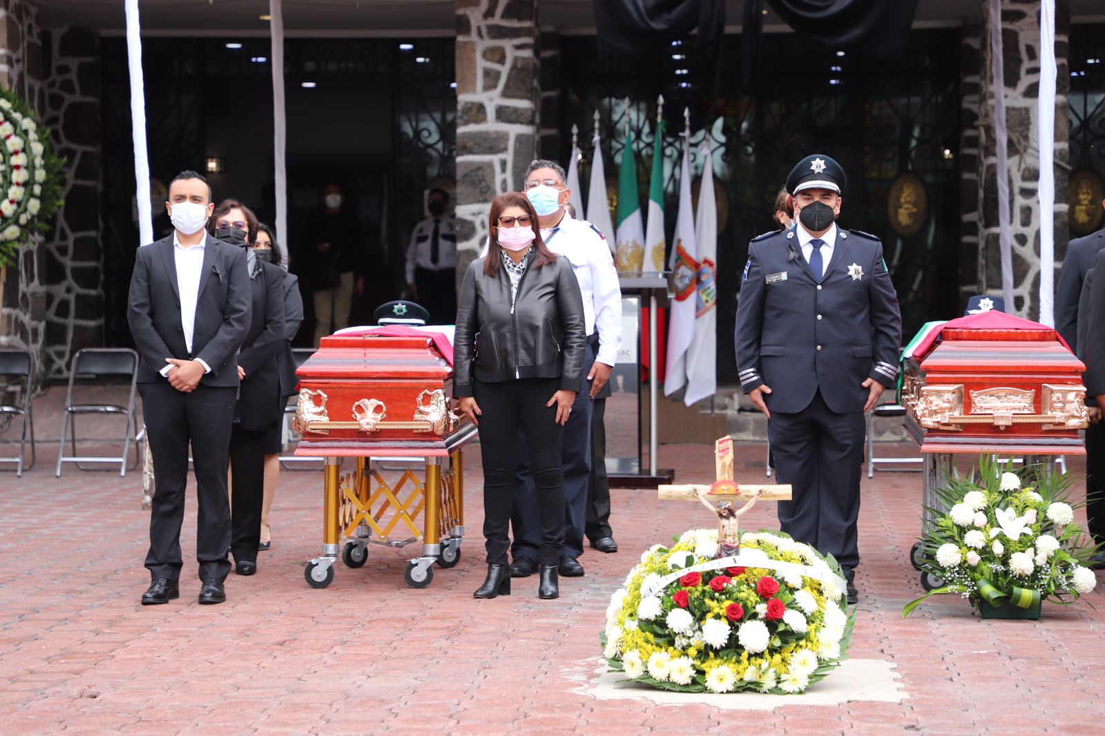 Por la izquierda: La presidenta Municipal de Tecámac, Mariela Gutiérrez Escalante, encabezó el Homenaje de Cuerpo Presente que rindió su gobierno a dos elementos de la policía municipal que fueron abatidos la tarde del pasado viernes, cuando acudieron en apoyo a un enfrentamiento con presuntos delincuentes que asaltaban una tienda de autoservicio en la cuarta sección de Villa del Real. Ahí fueron recibidos a balazos, cobrando la vida en el lugar de Benjamín Nathanael Martínez Castillo de 42 años y durante el trayecto al hospital, la oficial de 38 años, Jéssica Sánchez Morales.