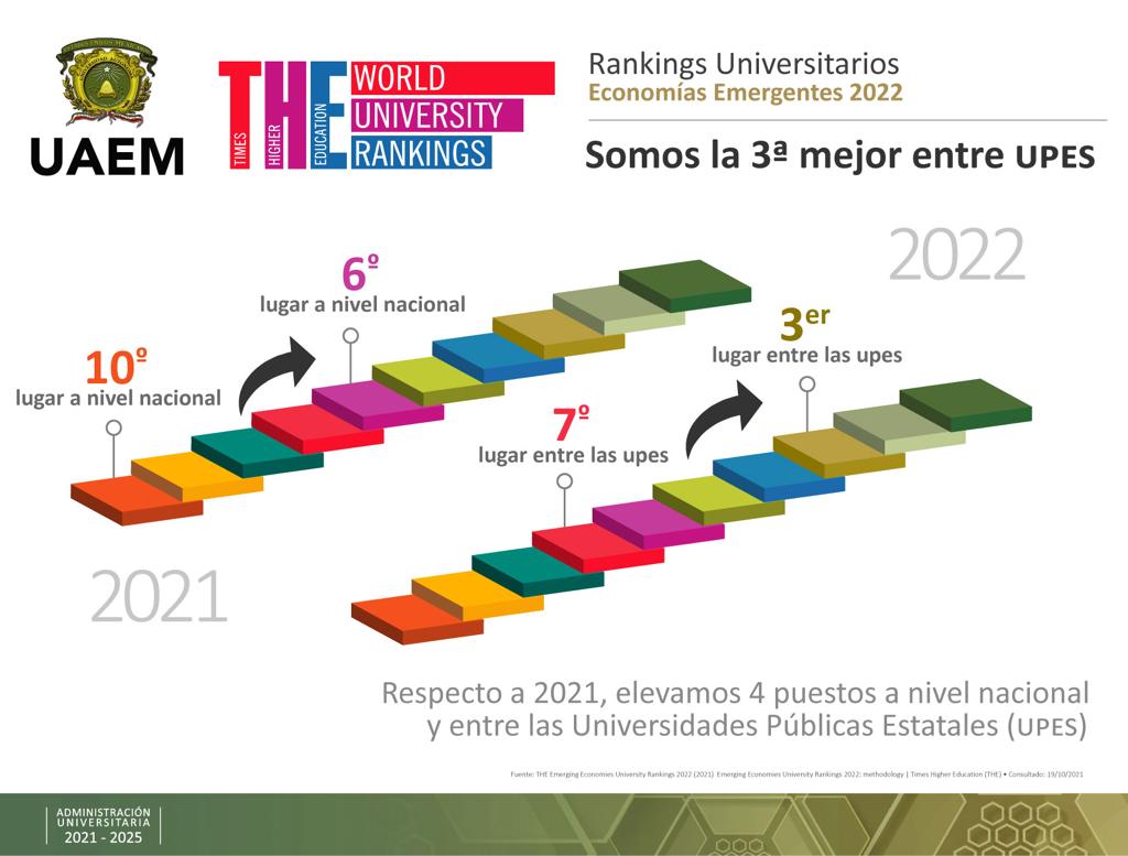 En su clasificación Rankings Universitarios de Economías Emergentes 2022, el THE incluyó a Instituciones de Educación Superior de países con economías emergentes avanzadas, que son consideradas por el Financial Times Stock Exchange de la Bolsa de Valores de Londres, por lo que la Autónoma mexiquense fue analizada entre un total de 698 universidades originarias de 50 países.
