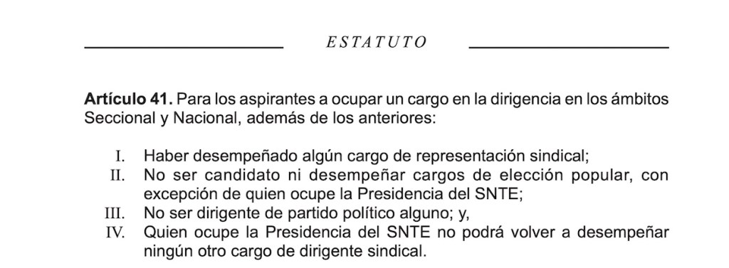 Sin embargo es claro que de acuerdo con el articulo 41del Estatuto del SNTE, para ocupar un cargo en la dirigencia, no se puede ser candidato ni desempeñar cargos de elección popular, con excepción de quien ocupe la Presidencia.