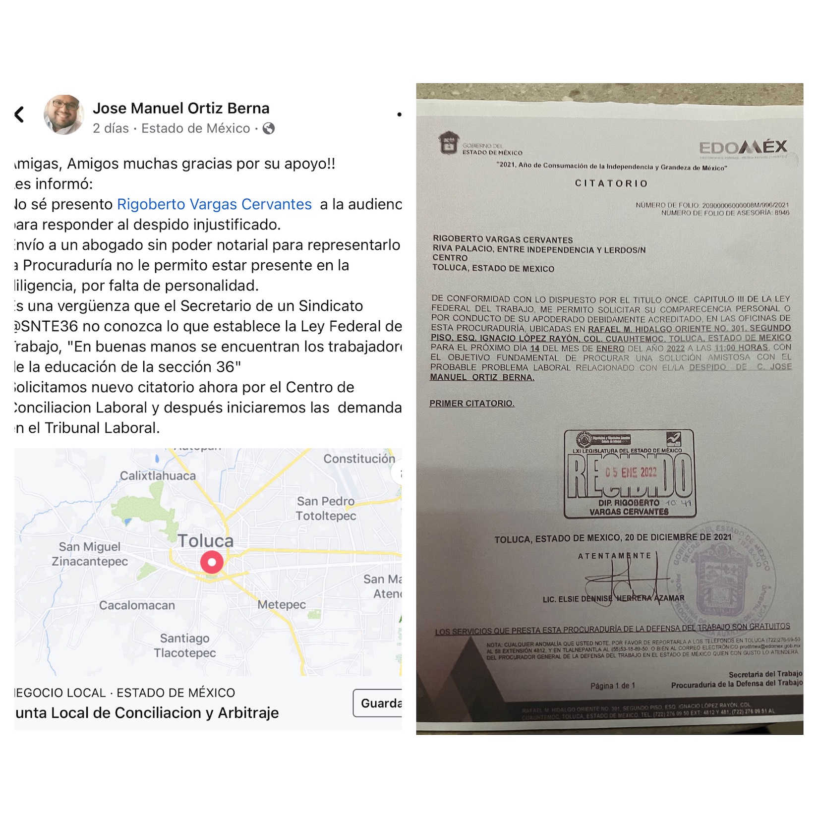 Esto también esta acreditado por los oficios que se adjuntan en este espacio, sin embargo uno de los quejosos dio a conocer en redes sociales que, Vargas no se presentó al citatorio y tampoco justificó de manera contundente ser representado por algún apoderado legal.