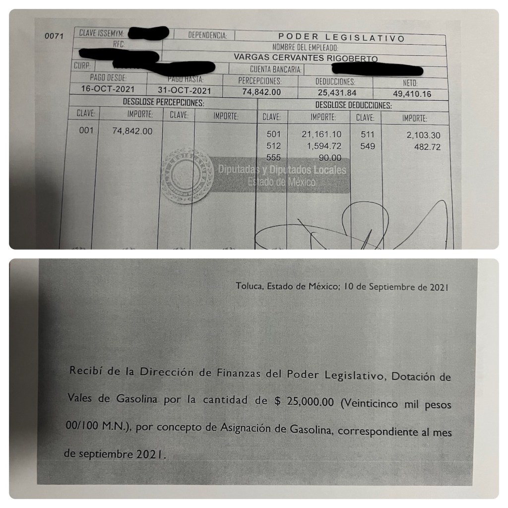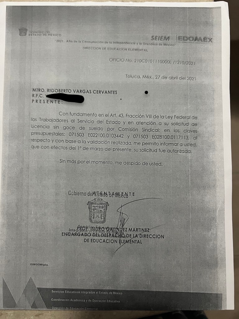 Para poder ser postulado al cargo que Rigoberto Vargas ostenta como diputado y jefe de la bancada de Nueva Alianza, solicitó licencia al SNTE, a partir del primero de Marzo del 2021, tal como se constata en el oficio, cuya copia se adjunta, mismo que fue firmado el 27 de abril del mismo año.
