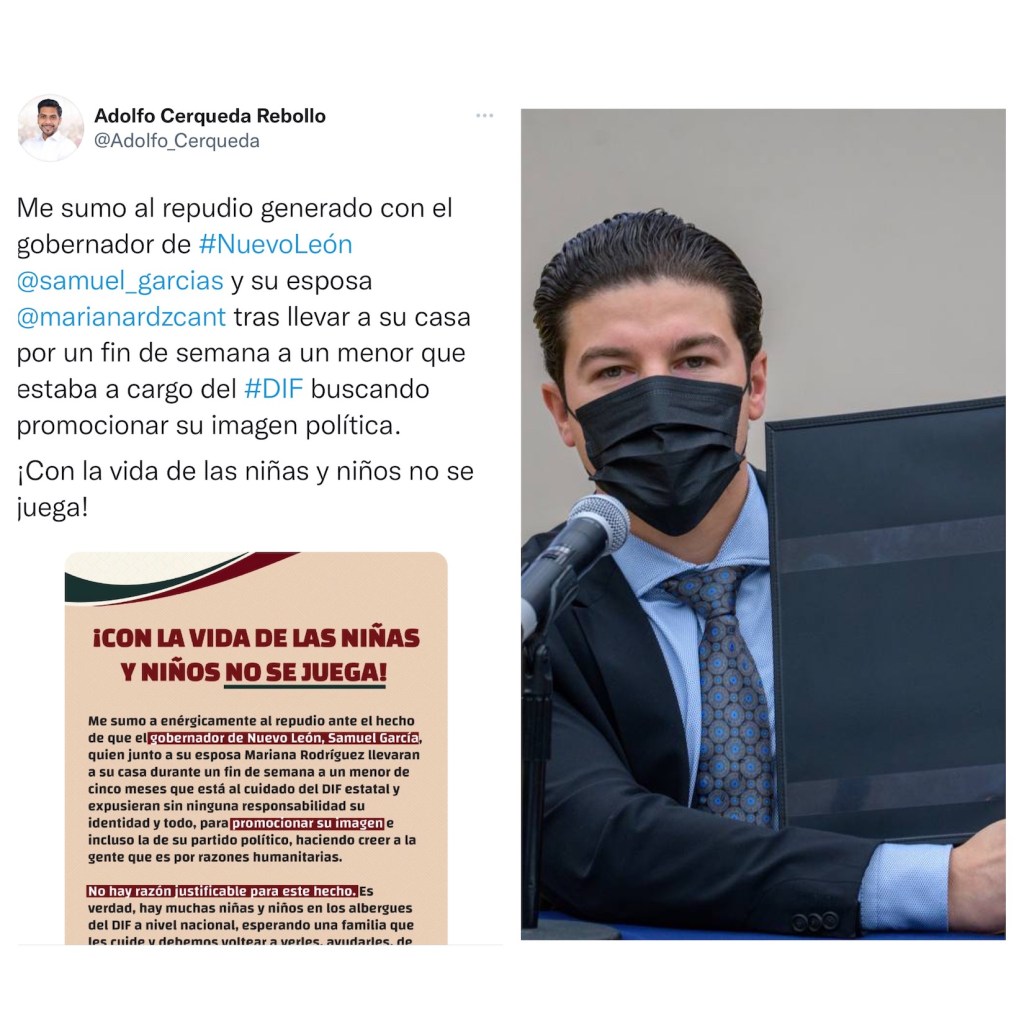 Por la izquierda: El presidente Municipal de Nezahualcóyotl, Adolfo Cerqueda Rebollo, descalificó al gobernador de Nuevo León, Samuel García Sepúlveda y su esposa, Mariana Rodríguez porque consideró que llevar a su casa, por un fin de semana, a un menor que estaba a cargo del DIF, tuvo la intención de promocionarse políticamente.