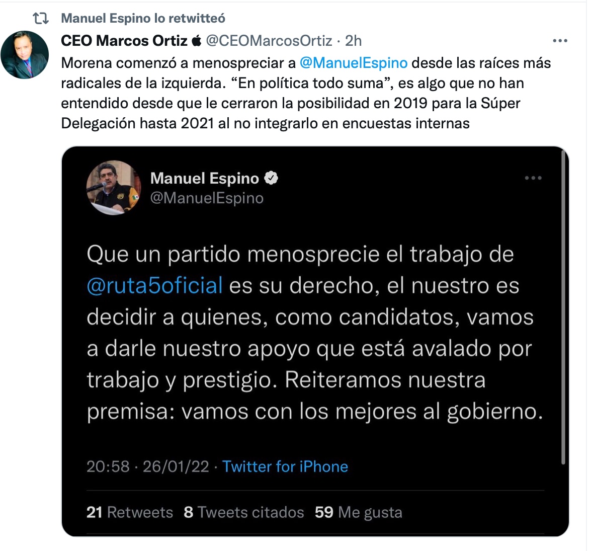 “Que un partido menosprecie el trabajo de Ruta Cinco, es su derecho, el nuestro es decidir a quienes, como candidatos, vamos a darle nuestro apoyo que está avalado por trabajo y prestigio. Reiteramos nuestra premisa: vamos con los mejores al gobierno”.