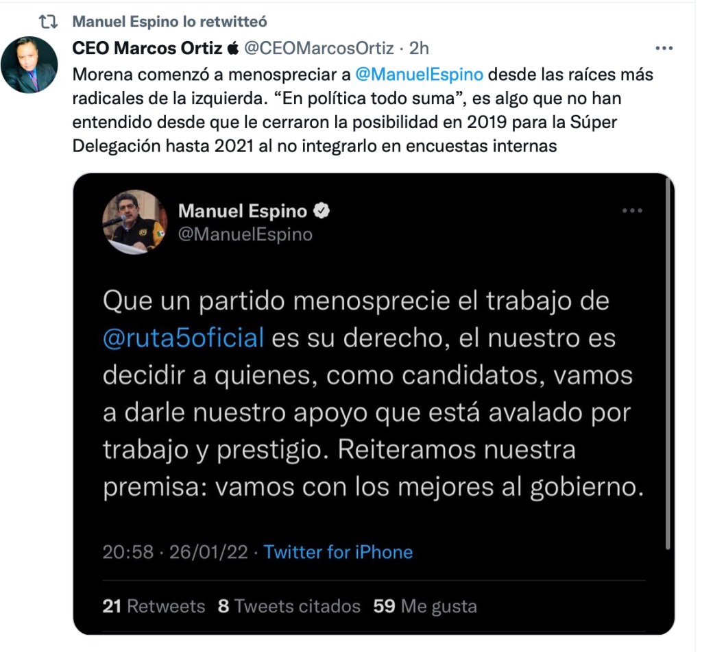 Por la derecha: En diferentes espacios comente que en Durango hay movimientos locales que pueden generarle competencia a MORENA en la elección de Gobernador. Manuel Espino Barrientos, quien buscó ser candidato, dio a conocer el siguiente mensaje en redes sociales, mismo que generó comentarios de todo tipo.